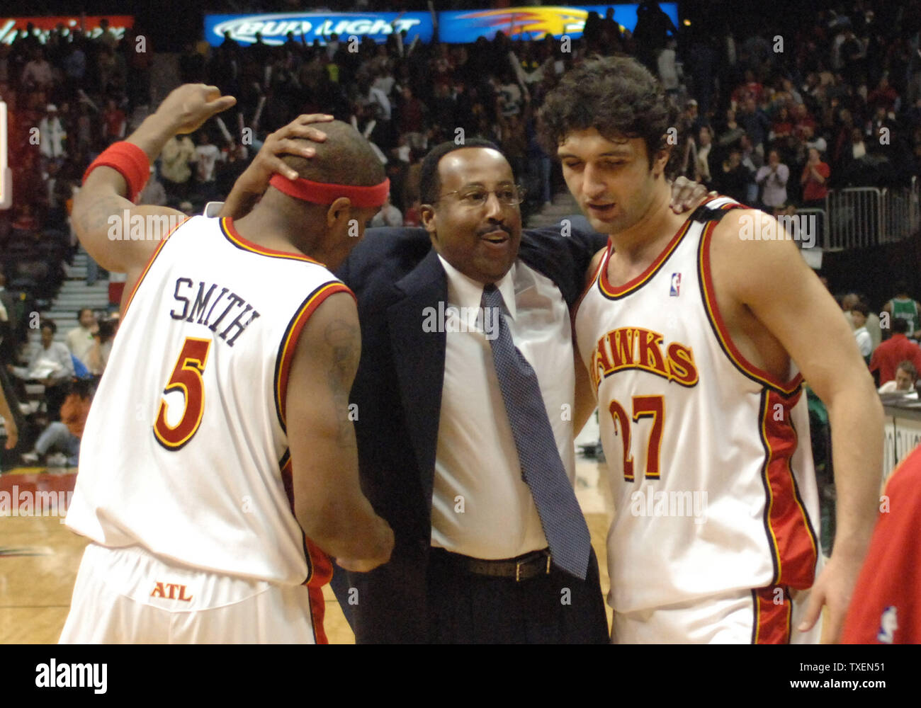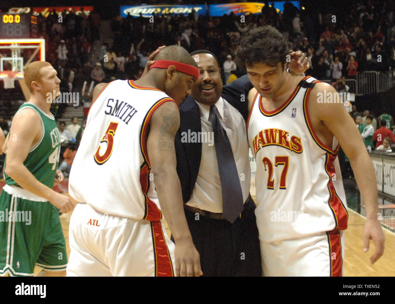 As The Buzzer Sounds Ending The Atlanta Hawks Game Against The Visiting Boston Celtics In Atlanta S Philips Arena November 23 2005 Hawks Coach Mike Woodson Grins And Hugs Josh Smith 5 And