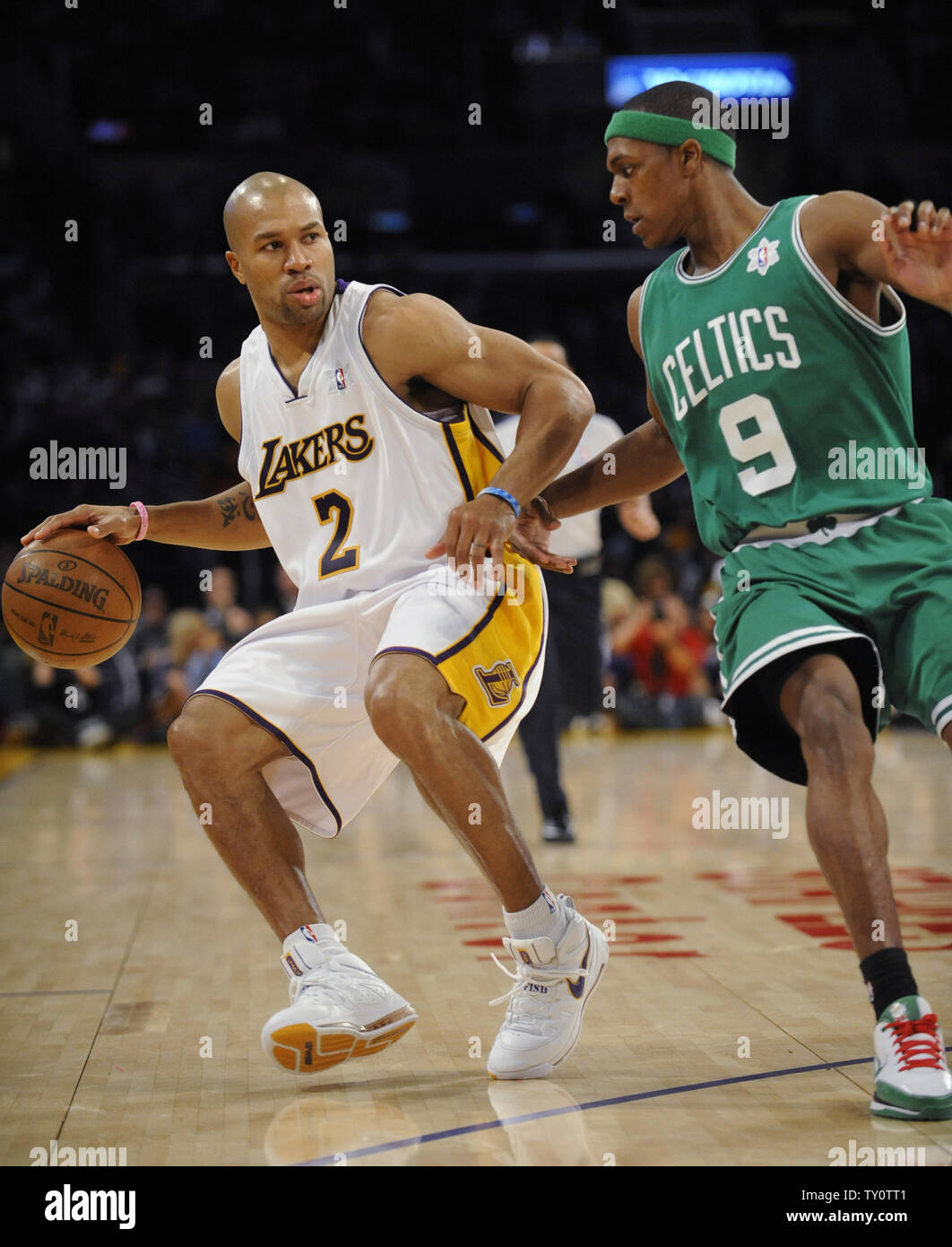 Los Angeles Lakers Derek Fisher 2 Carries The Ball Against Boston Celtics Rajon Rondo 9 During The Second Half In Los Angeles On December 25 2008 The Lakers Beat The Celtics 92 83