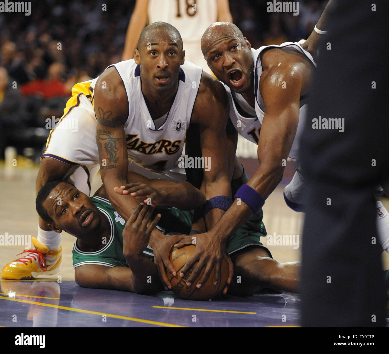 Boston Celtics Tony Allen L And The Los Angeles Lakers Kobe Bryant C And Lamar Odom R Look For The Referee S Call As They Battle Over A Loose Ball During The Second